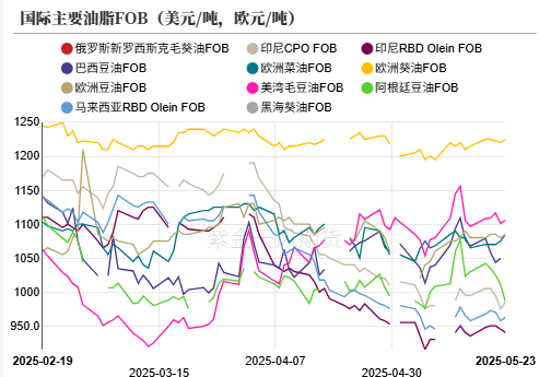 截至2025年5月23日,阿根廷豆油和巴西豆油跌幅明显,欧洲菜油和葵油涨幅较多,马来西亚和印尼棕榈油价格平稳。