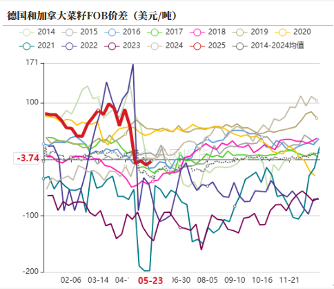 截至到5月23日,德国和加拿大菜籽价格持平,澳大利亚和加拿大菜籽价差持续走扩,乌克兰和加拿大菜籽价差小幅反弹。